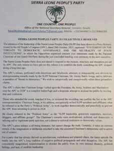 The APC, in its statement dated October 20, alleged that Chairman Songa’s call to the “President, Army, Soldiers and Marshals” posed a threat to democratic governance and state institutions. But the SLPP has fired back, calling the accusations baseless and false.