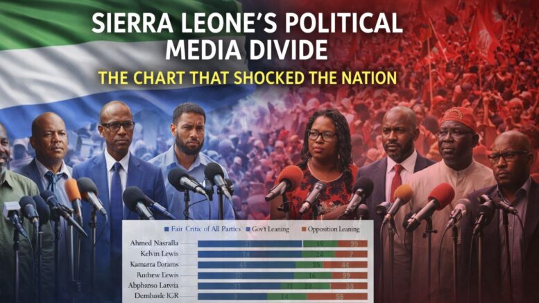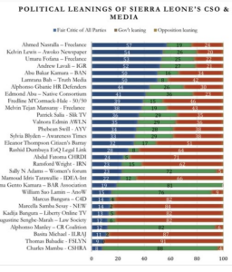 The chart, titled Political Leanings of Sierra Leone’s CSO & Media, does more than rank journalists and civic voices. It maps a widening divide inside Sierra Leone’s public discourse. It places some of the country’s best-known media figures, commentators, and civil society actors on a political spectrum that measures three dimensions: fair criticism of all parties, government-leaning, and opposition-leaning.